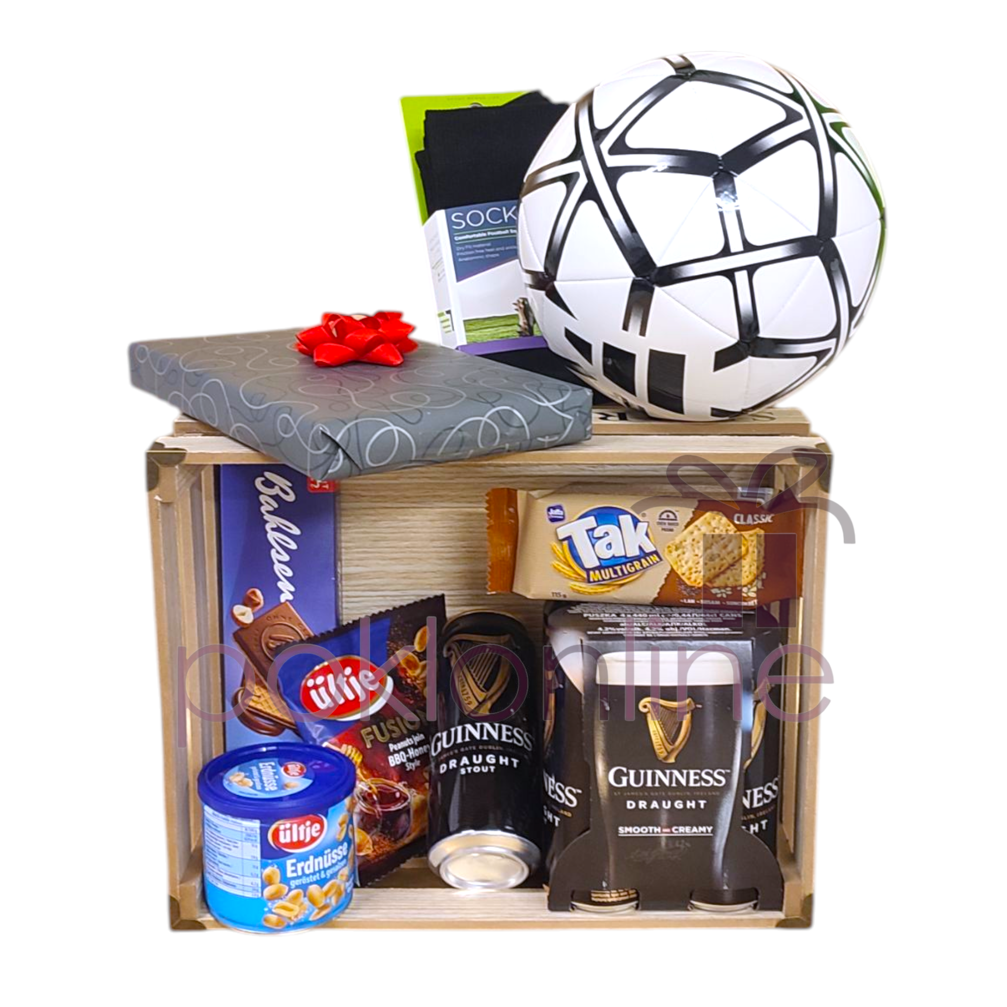 Poklon sadrži: nogometna lopta, sportske čarape, pivo Guinness 4kom, praline Lindt 125g, kikiriki Ultje 180g, kikiriki Ultje 150g, krekeri Tak 100g, keksi Bahlsen 125g.
