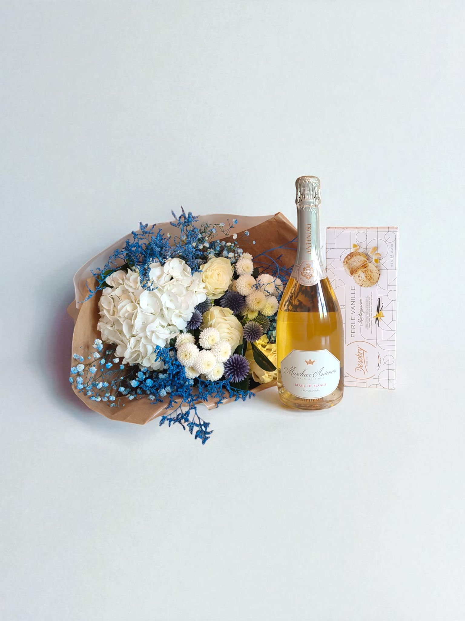 Poklon sadrži: pjenušac Antinori,Montenisa Blanc de Blancs 0,75l, praline Desobry 100g ili Lindt 125g, buket sezonskog cvijeća prema dogovoru.