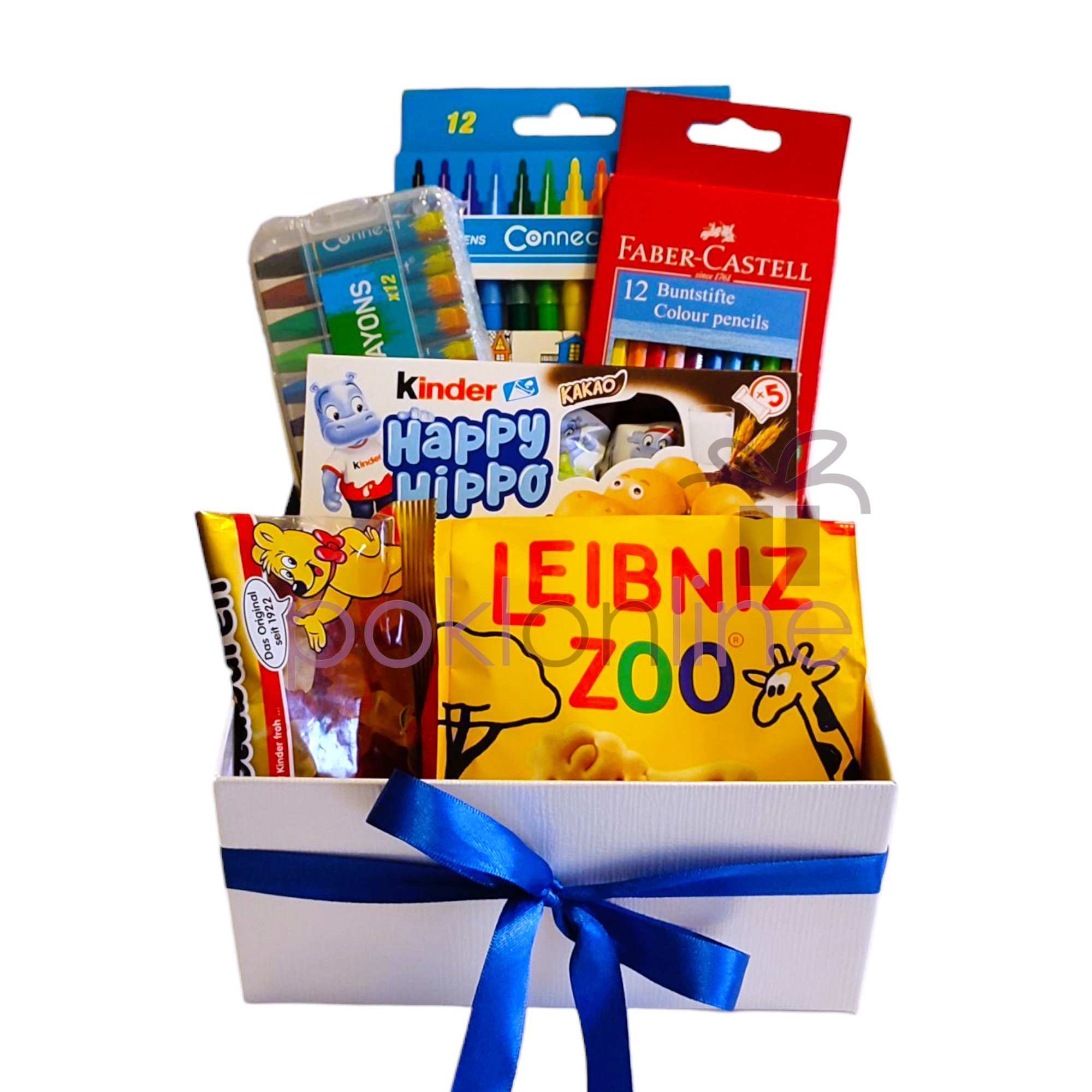 Poklon sadrži: flomasteri Connect 12kom, pastele Connect 12kom, bojice Fber-Castell 12kom, Kinder Happy Hippo 100g,gumeni bomboni Haribo 100g, keksi s maslacem u obliku životinja Leibniz 125g.